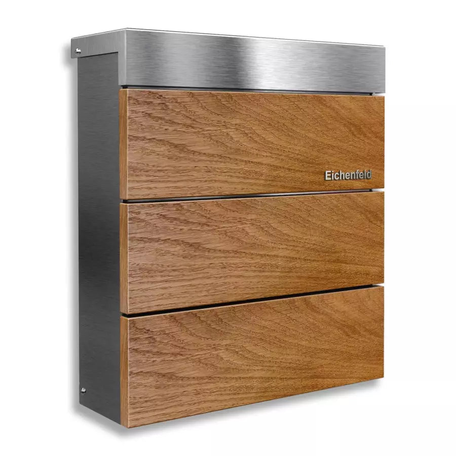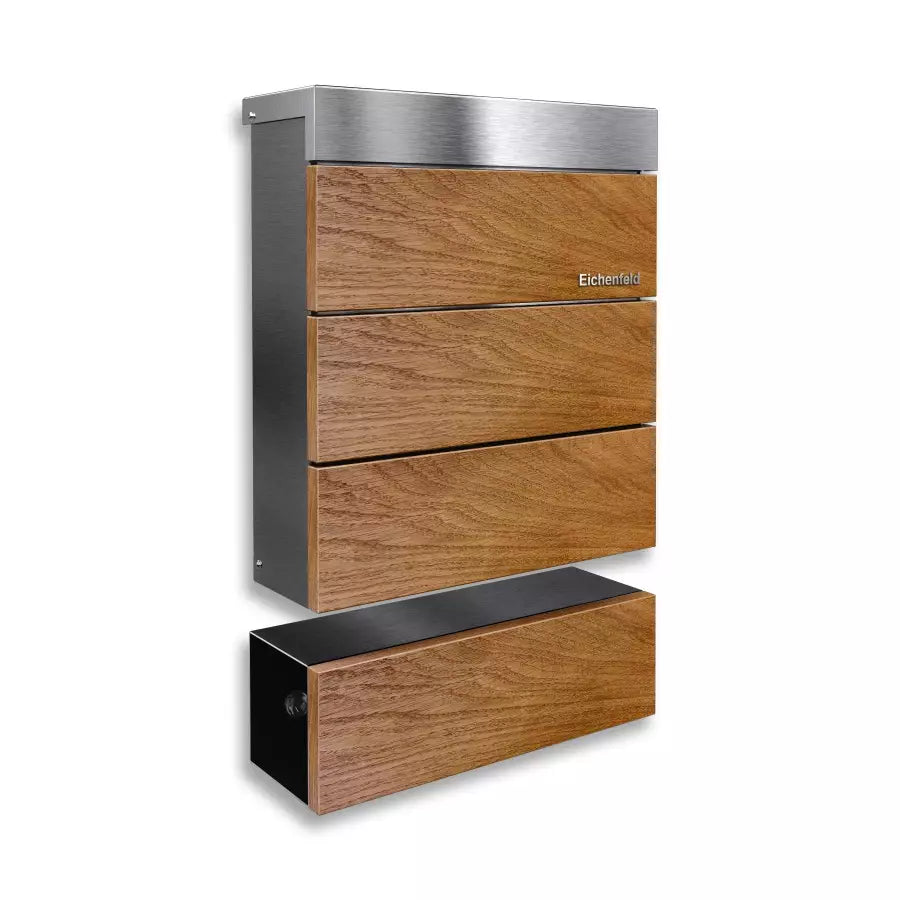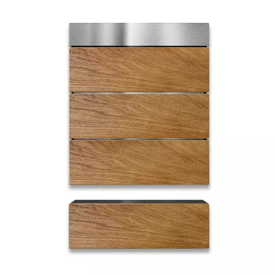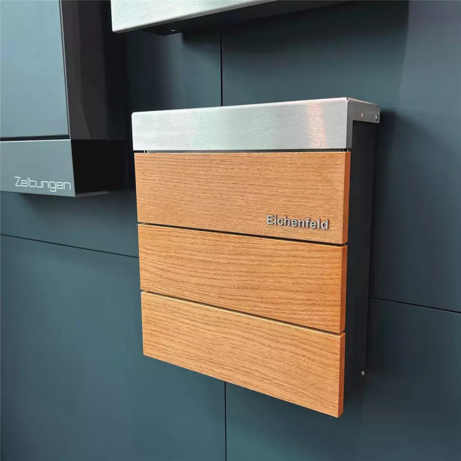 | Massiivne postkast on roostevabast terasest V2A ja ehtsast tammepuidust. Metzleri Masiva kollektsioon. Võimalik lisada sobiv ajalehesahtel. Profileeritud tähtedest kliendi soovitud kiri. Tootja: Metzler. Laius × Kõrgus × Sügavus: 33,00 × 35,00 × 9,15 cm. |