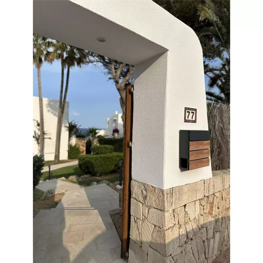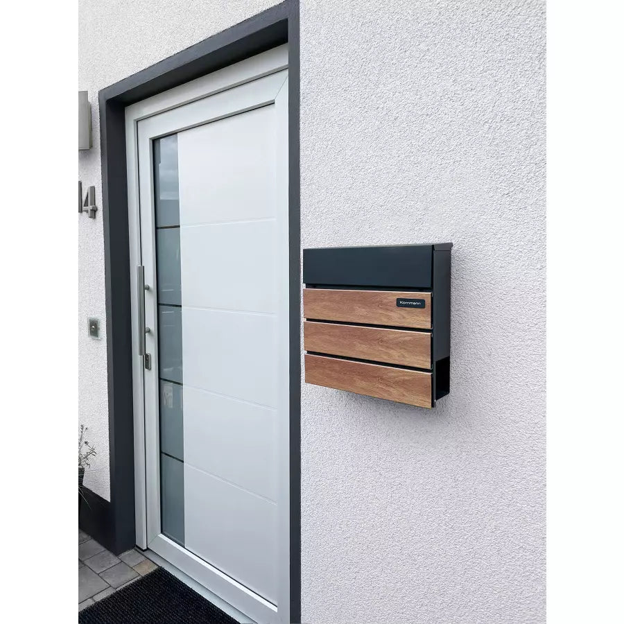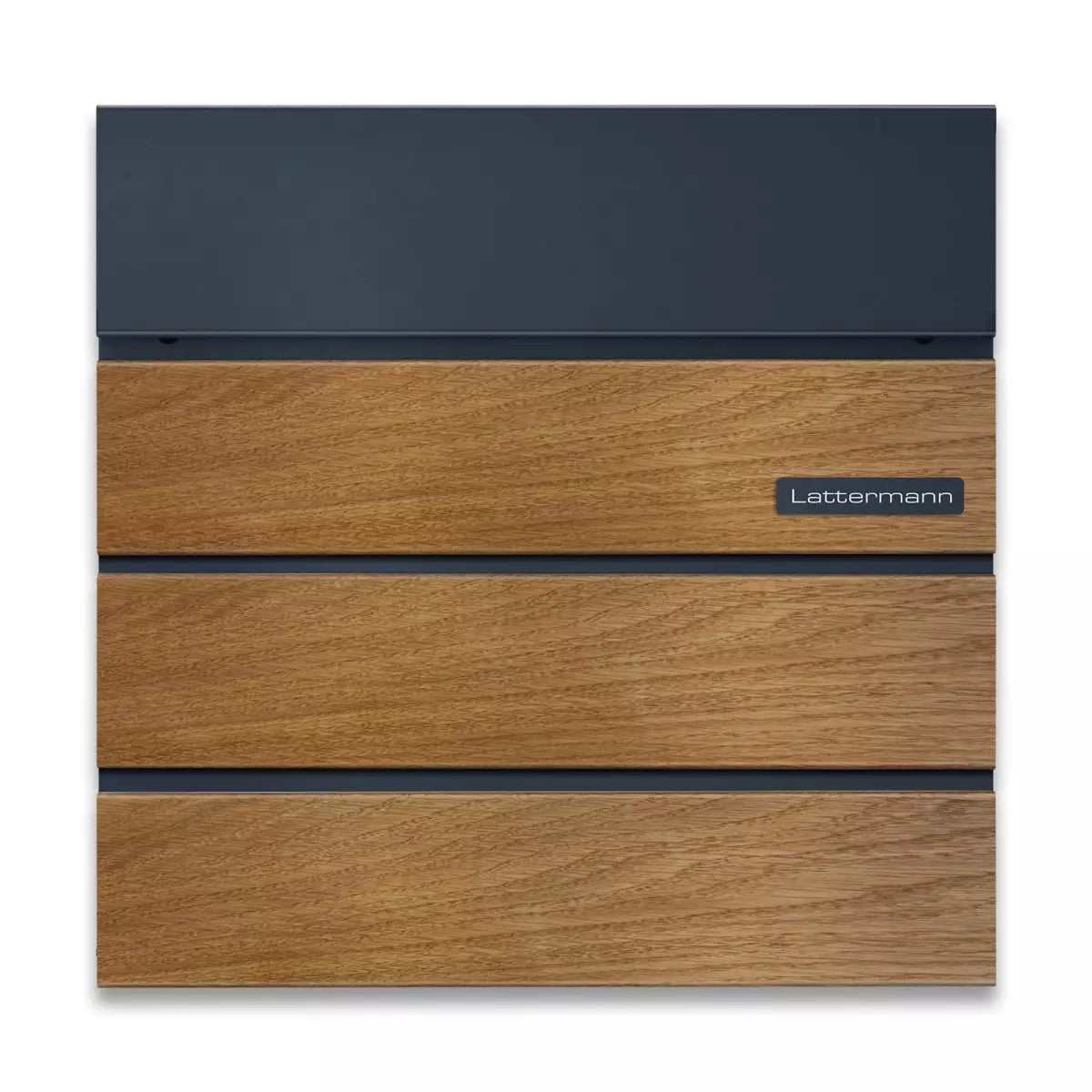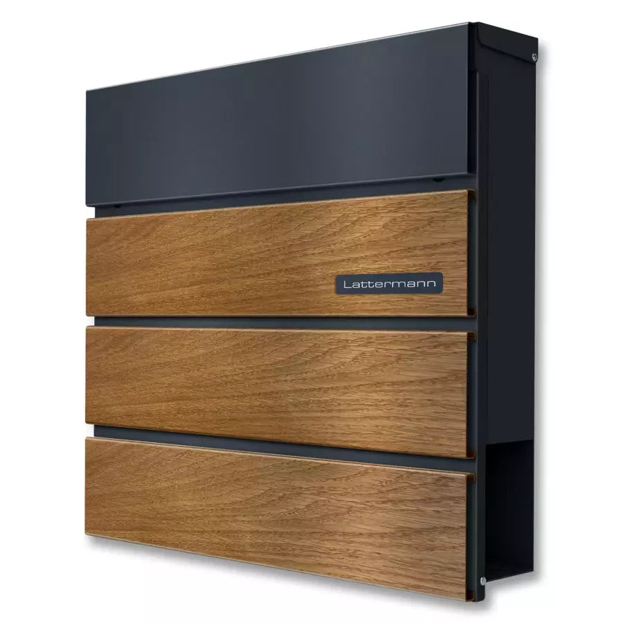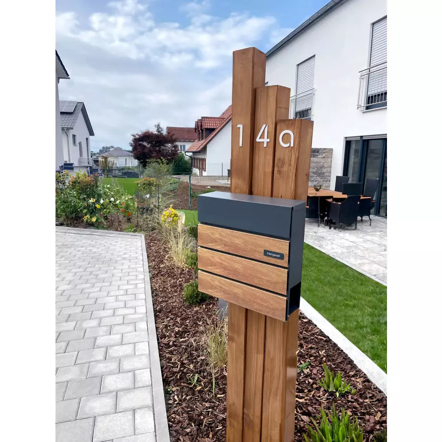 | Massiivne postkast on ilmastikukindlast, antratsiithalliks pulbervärvitud terasest ja peale kinnitatud tammeimitatsiooniga. Graveeringuga nimesilt on kleebitav ja vahetatav. Integreeritud ajalehesahtel, mõlemast otsast avatud. Tootja: Metzler. Laius × Kõrgus × Sügavus: 37,00 × 37,00 × 10,50 cm. |